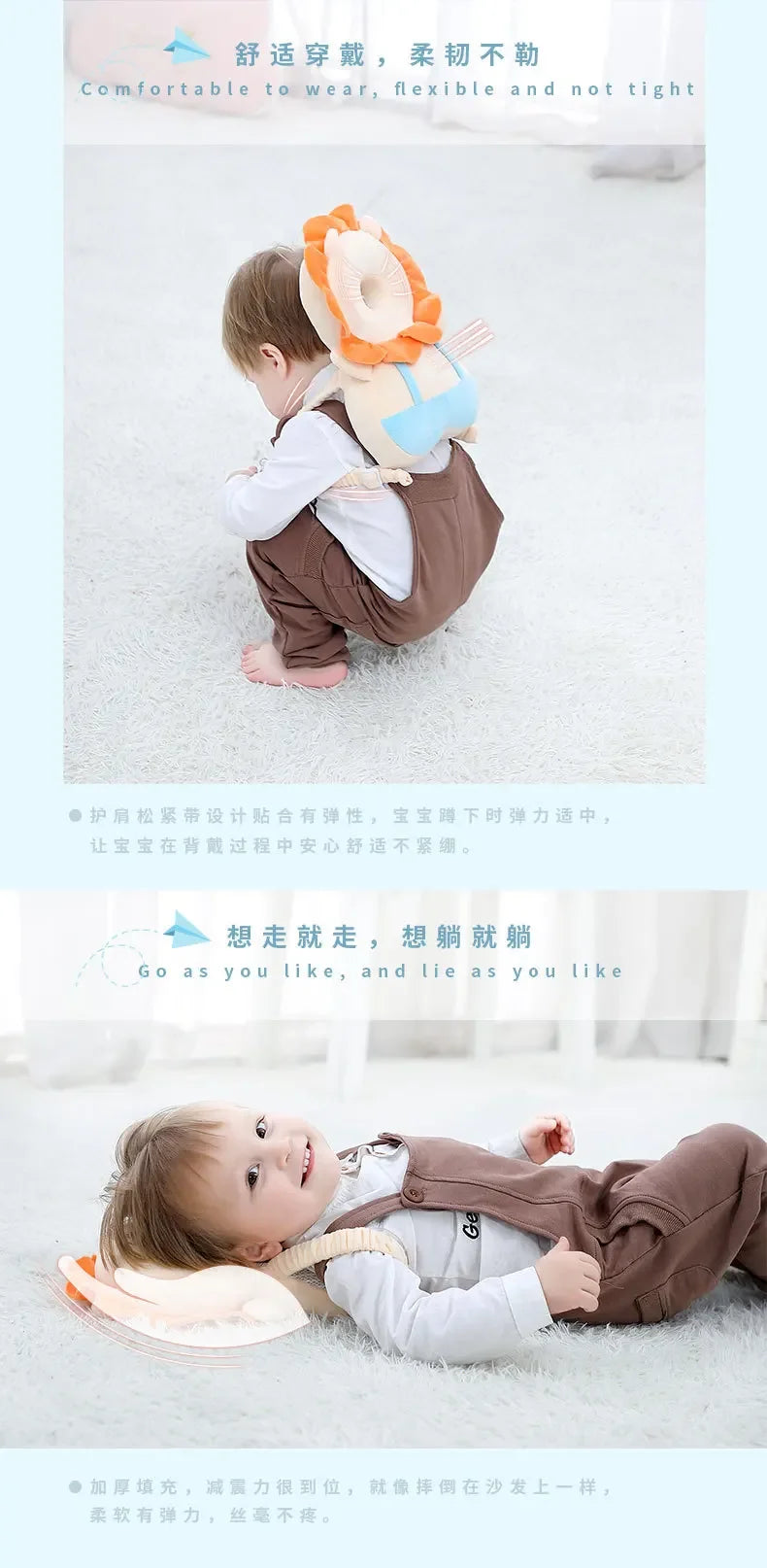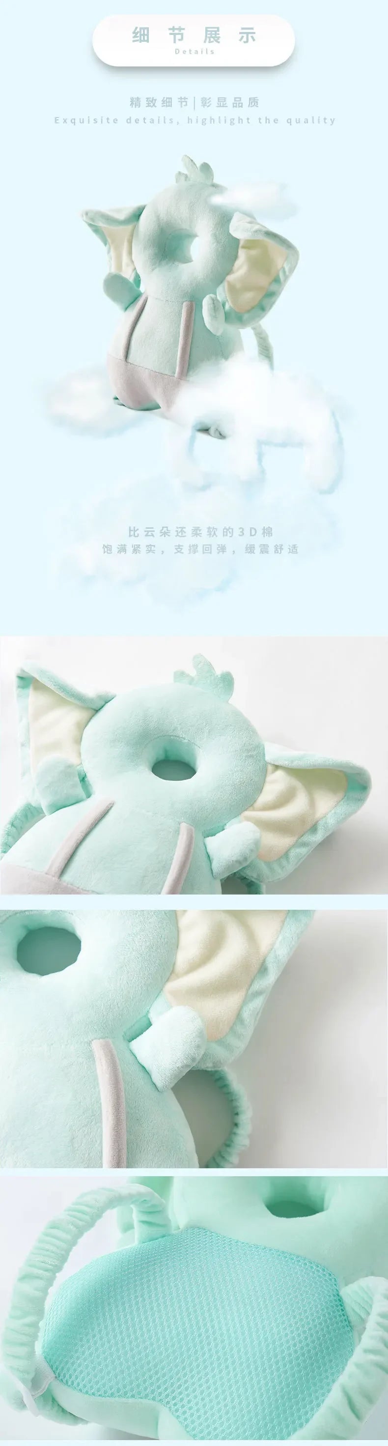 This baby head pillow has a more reasonable design. It protects the head and shoulders. It protects the head while being breathable and not stuffy. The baby will be more stable when he walks with no pressure on his back. The product is novel and cute, it can prevent falling during the day and care for the baby's safety; at night, it can be used as a soothing doll to soothe the baby's sleep. It is the best choice for babies during their growth period, and it is also a powerful little helper for mothers.